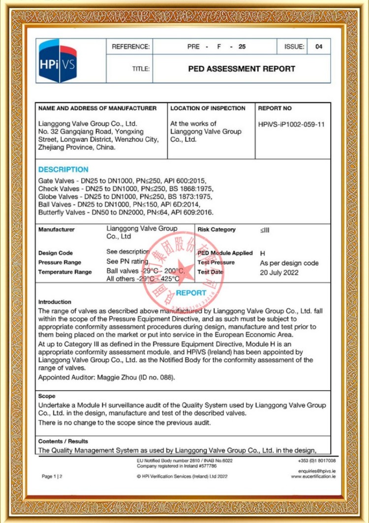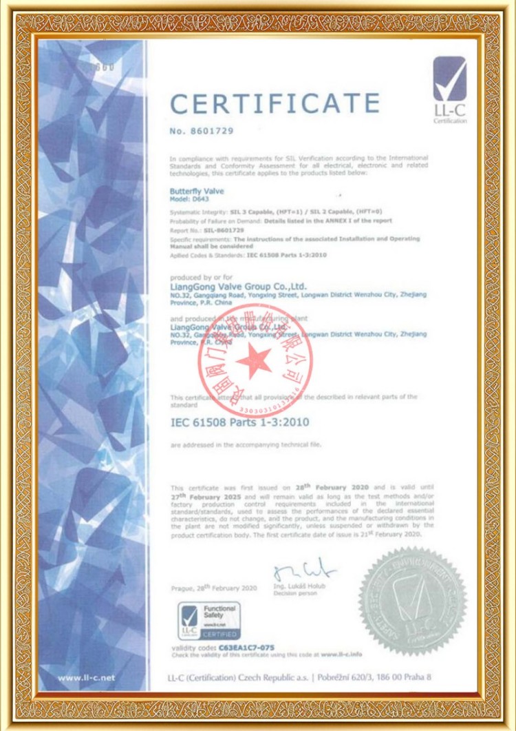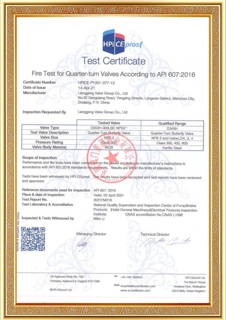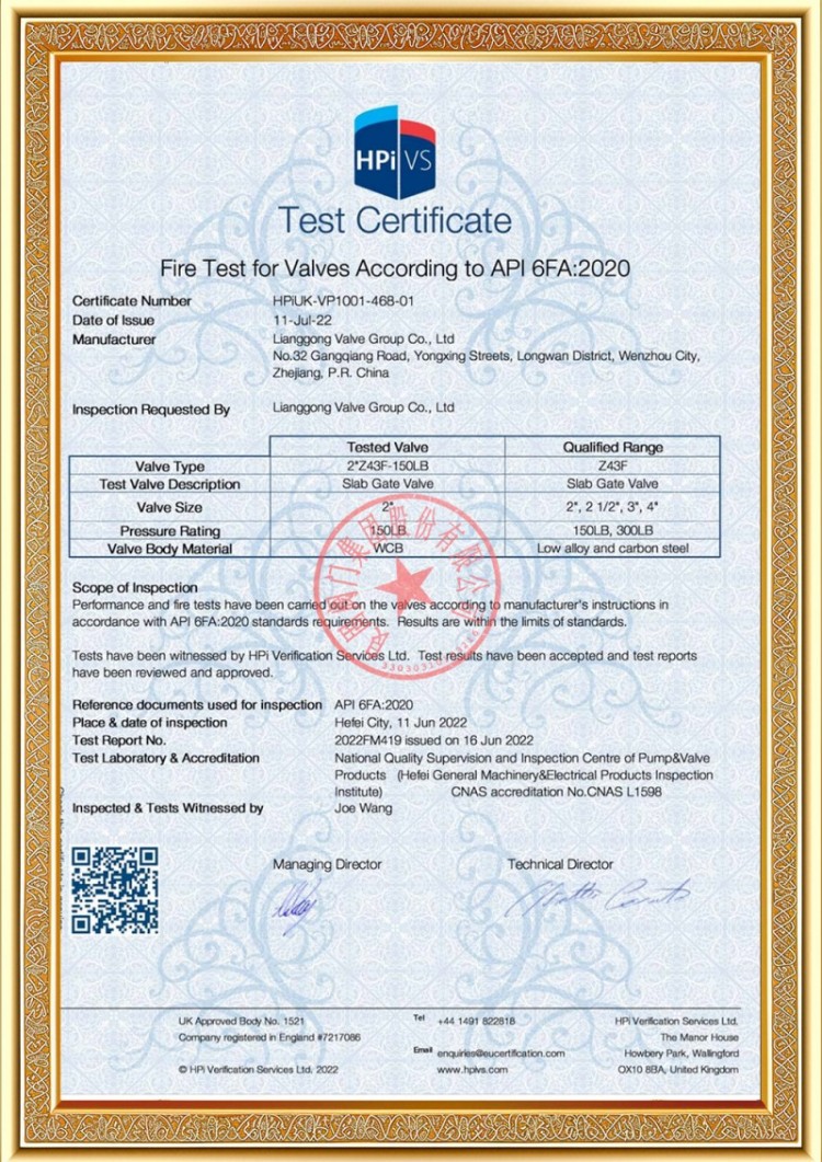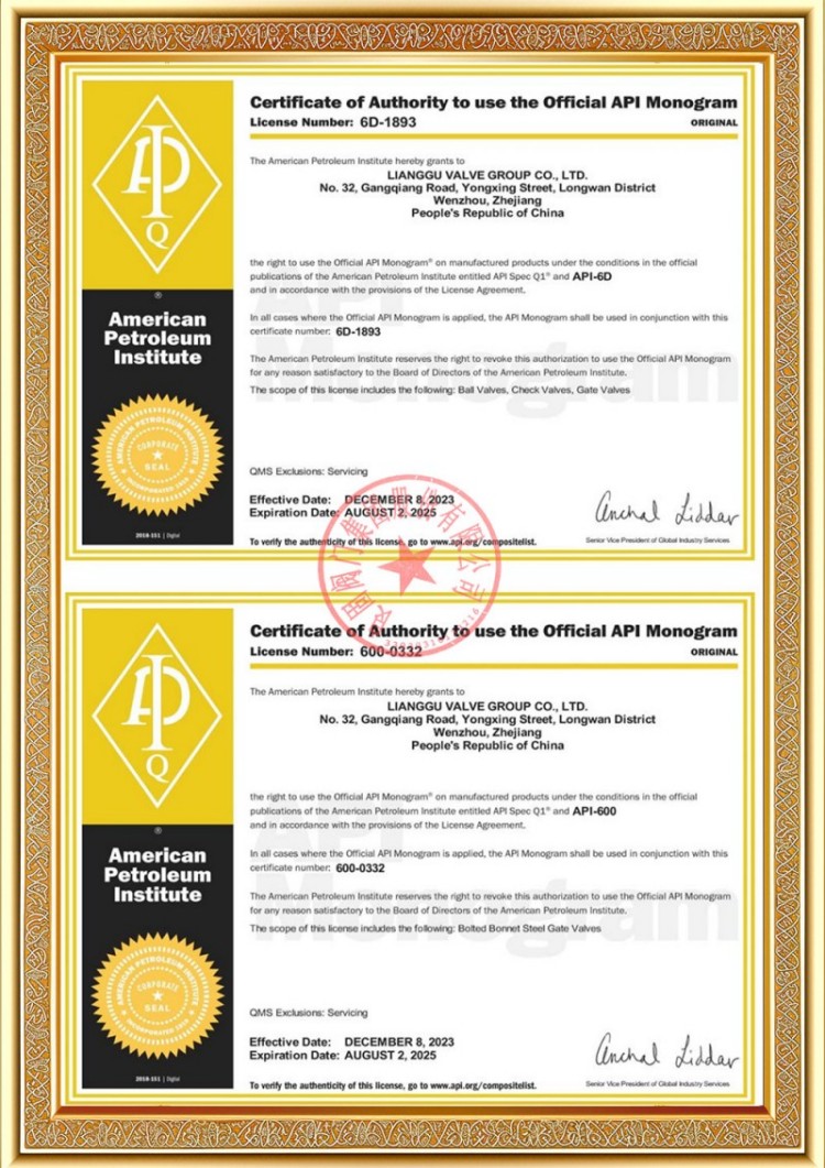 Firmamız çeşitli basınçlı boru hattı vanası üretim lisanslarına sahip olup ürünlerimiz TS A1, ISO 9001, ISO 14001, ISO 45001, API 6D, API 600, APL 609, CE/PED, API 607, API 6FA, ISO 15848-1 ve EAC sistem ve ürün sertifikalarına sahiptir. Ayrıca küresel vana, kelebek vana, emniyet vanası, stop vanası gibi çeşitli vanalara yönelik buluş patent sertifikalarımız mevcuttur.